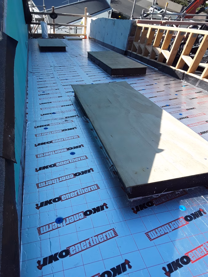 The project involved installing Nuraply 3PM two-layer torch-on membrane to plywood roof surfaces across Level 3 and Level 4 decks and the lower roof area, including chase-cut flashing to concrete parapet upstands, bitumen fillets to all upstands, and detailing to outlets and overflows. The main roof received an Enertherm Non-Tapered Warm Roof System featuring 70mm PIR insulation boards with Nuraply 3PM two-layer torch-on membrane to both the flat roof area and gutters, complete with detailing to gutter outlets and overflows.