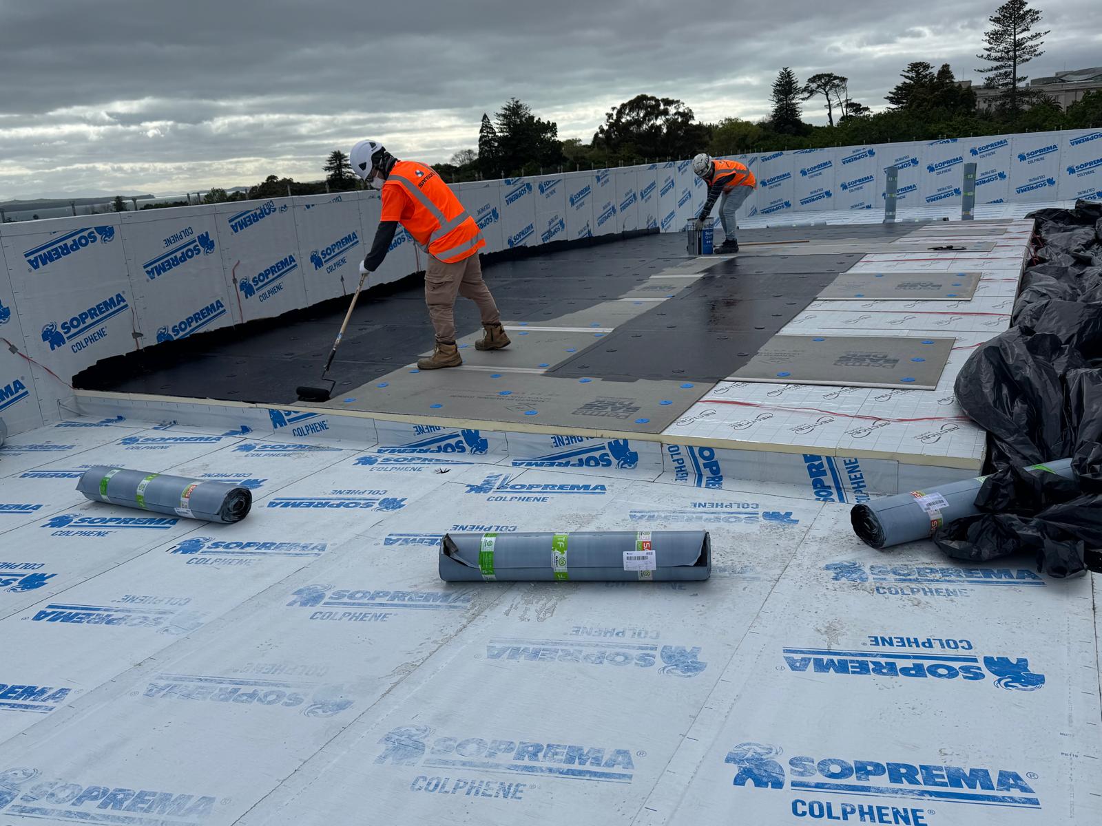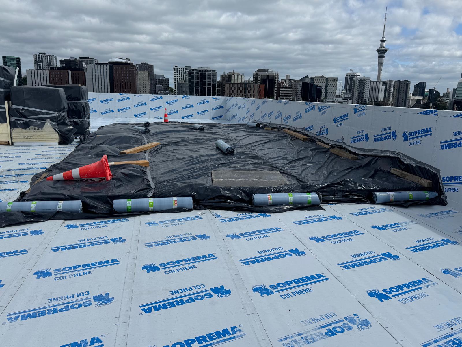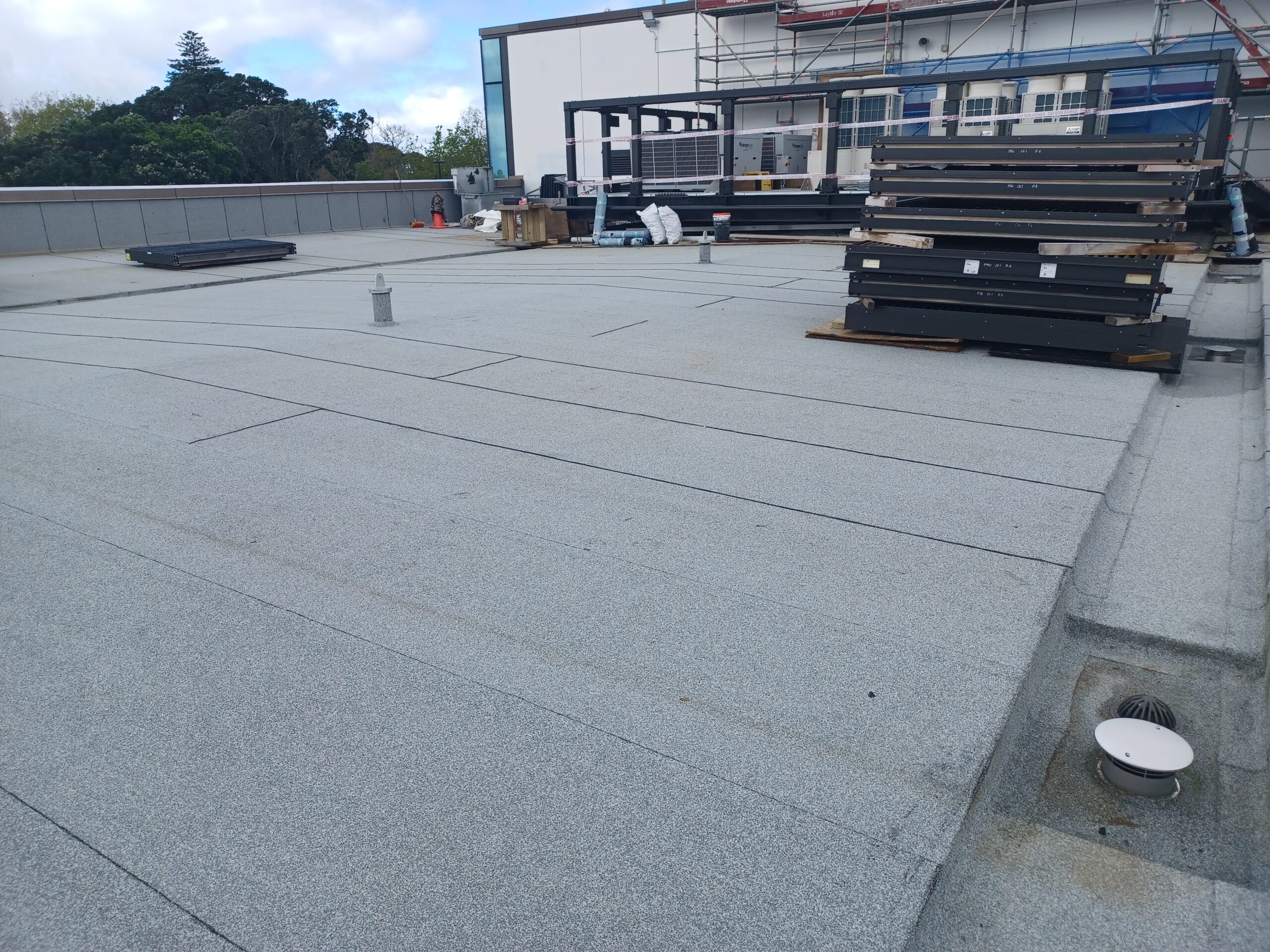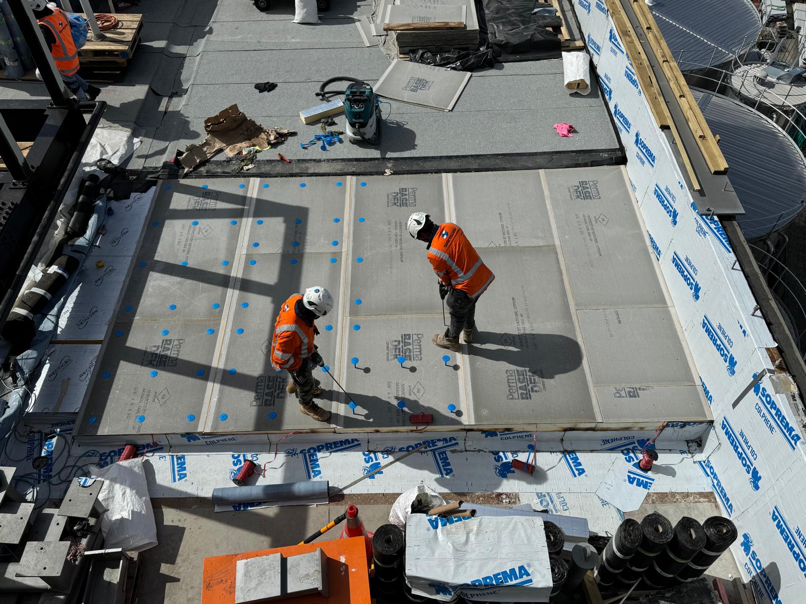 The roofing component represented the largest package across three trades, featuring warm roof installations on levels 4, 5, and 6 across approximately 2,000m², alongside applying liquid coatings to multiple plant rooms.