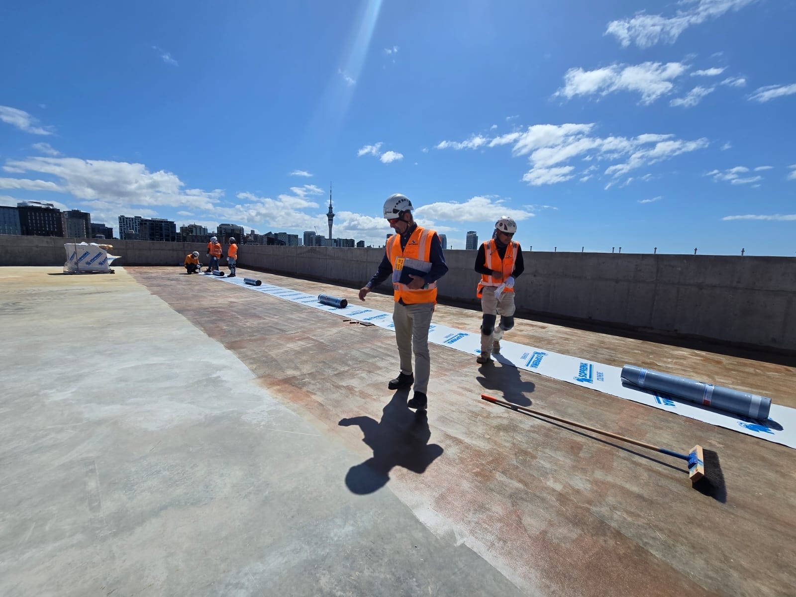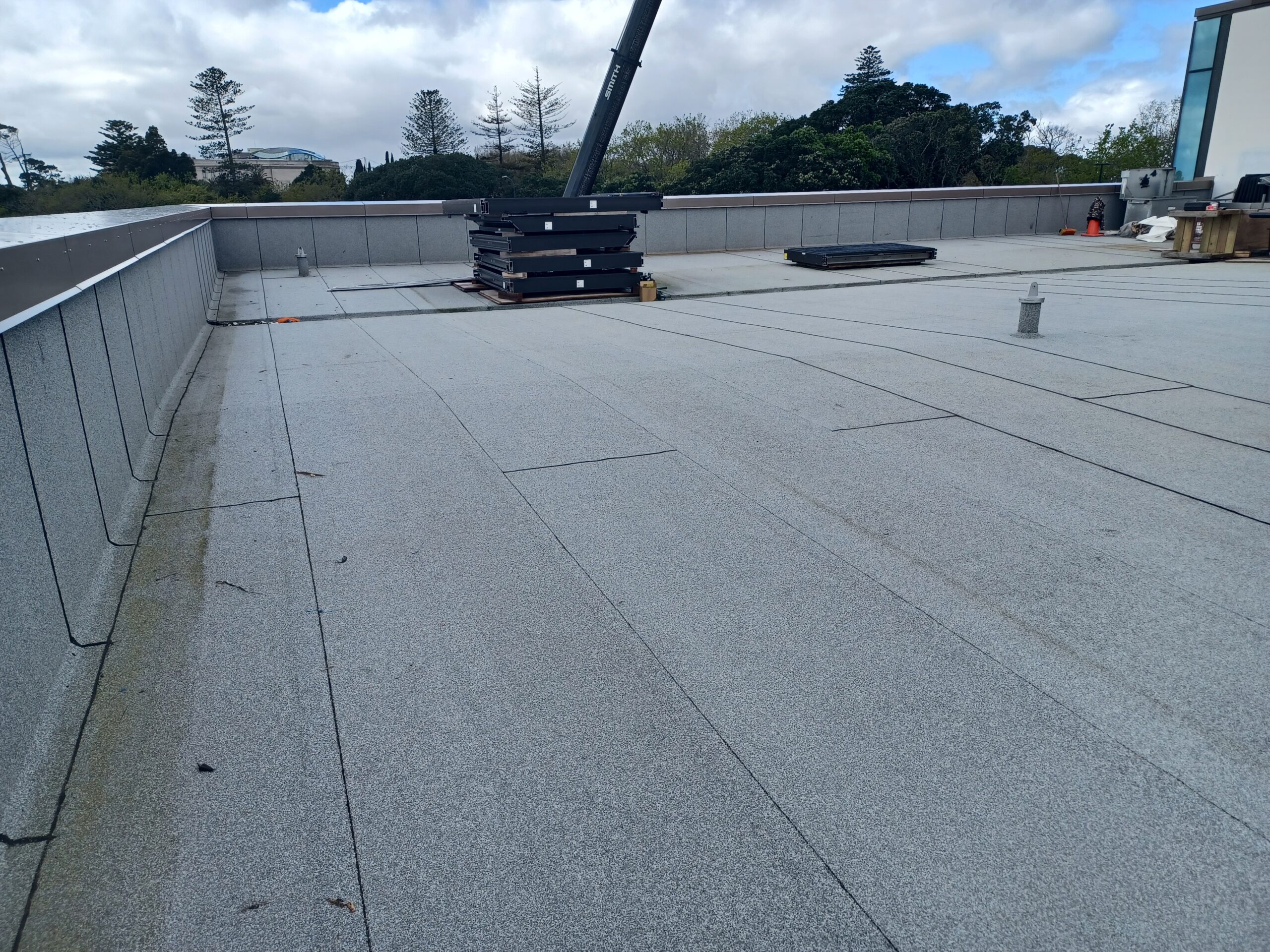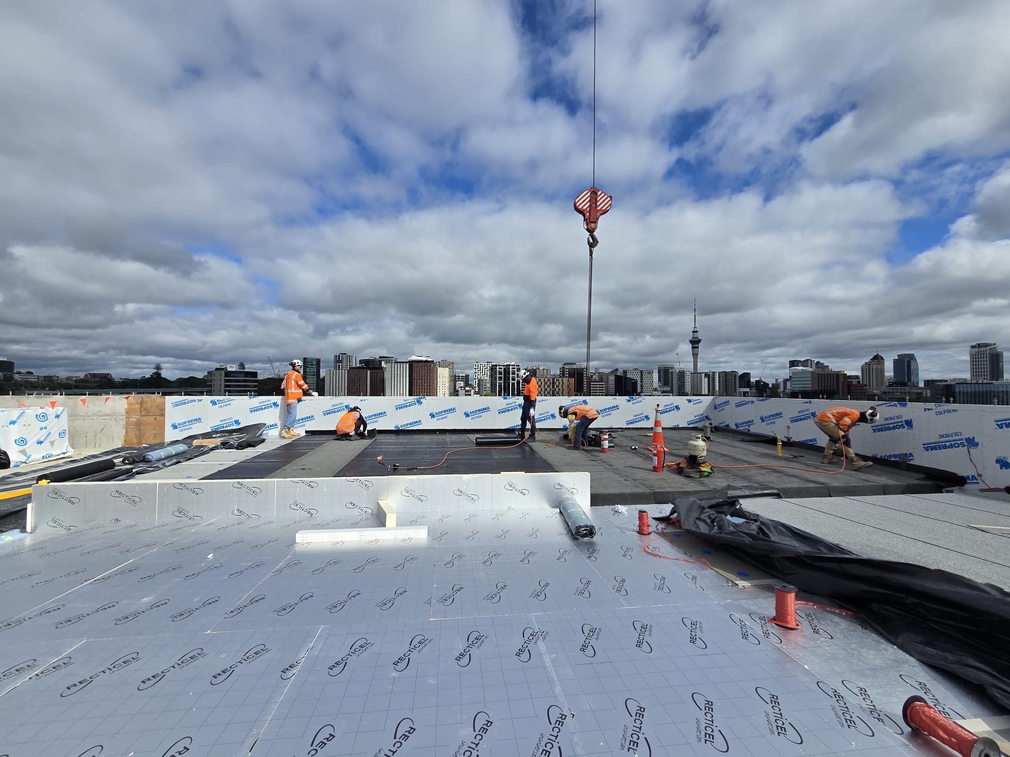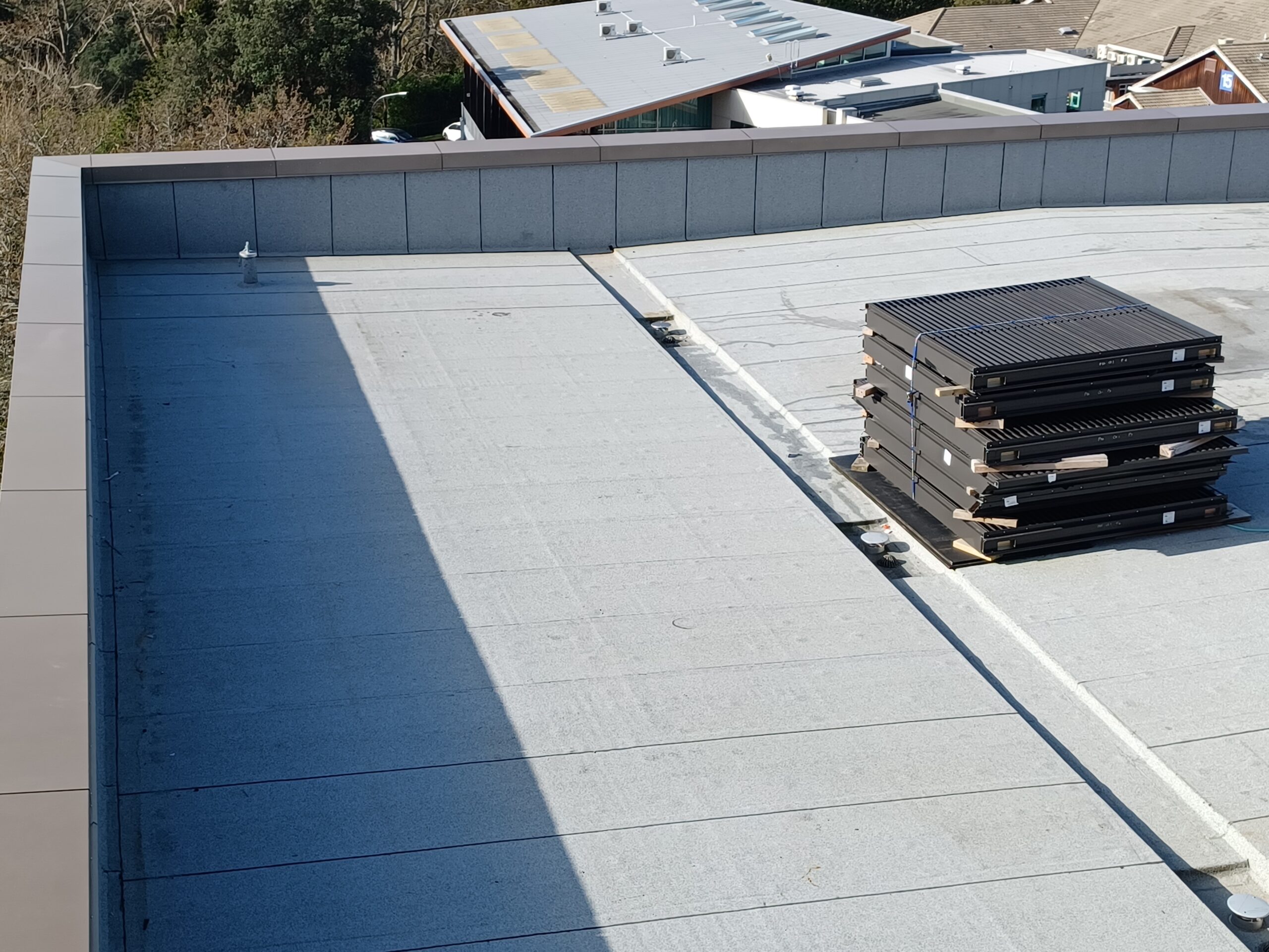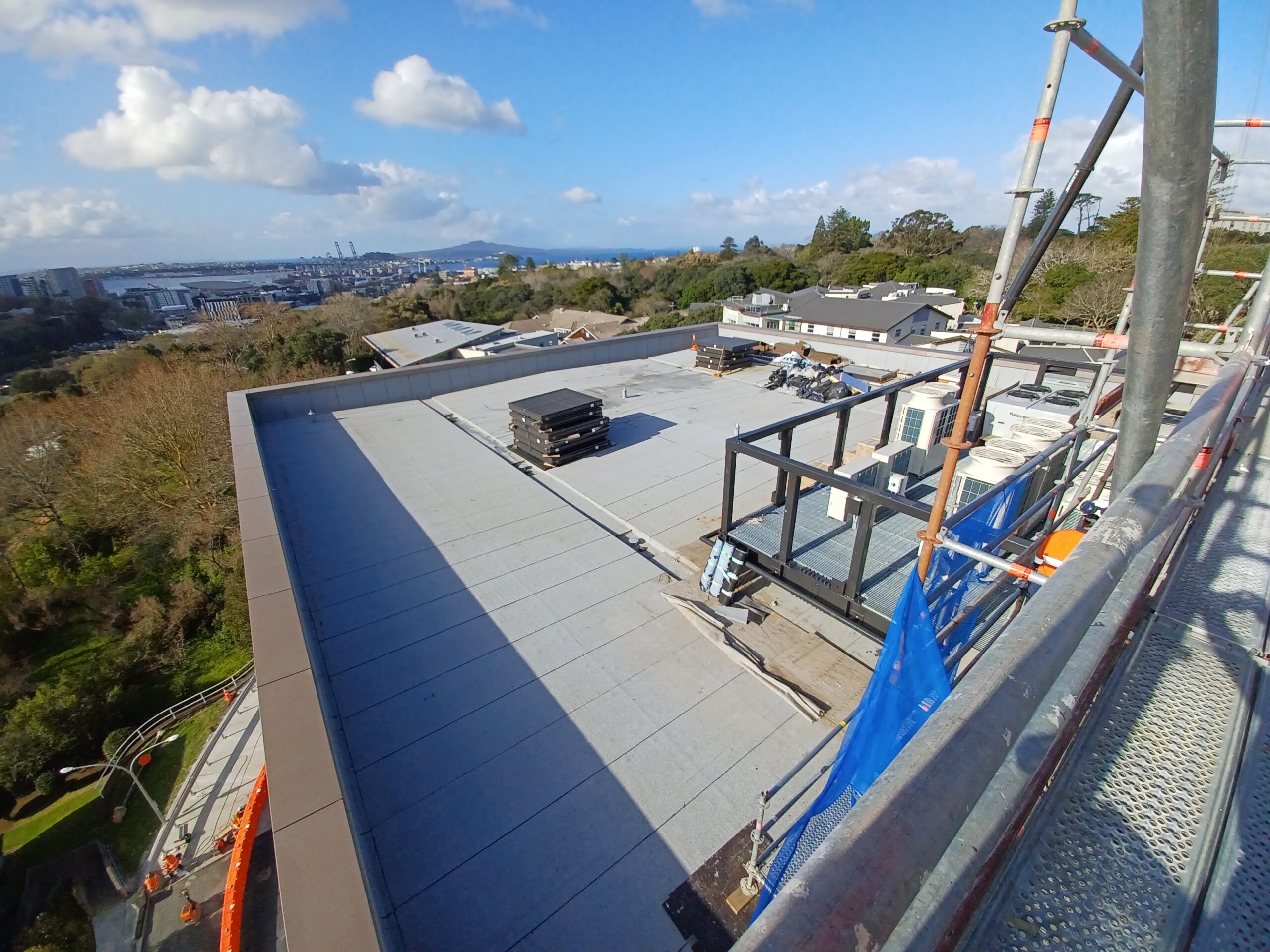 The roofing component represented the largest package across three trades, featuring warm roof installations on levels 4, 5, and 6 across approximately 2,000m², alongside applying liquid coatings to multiple plant rooms.