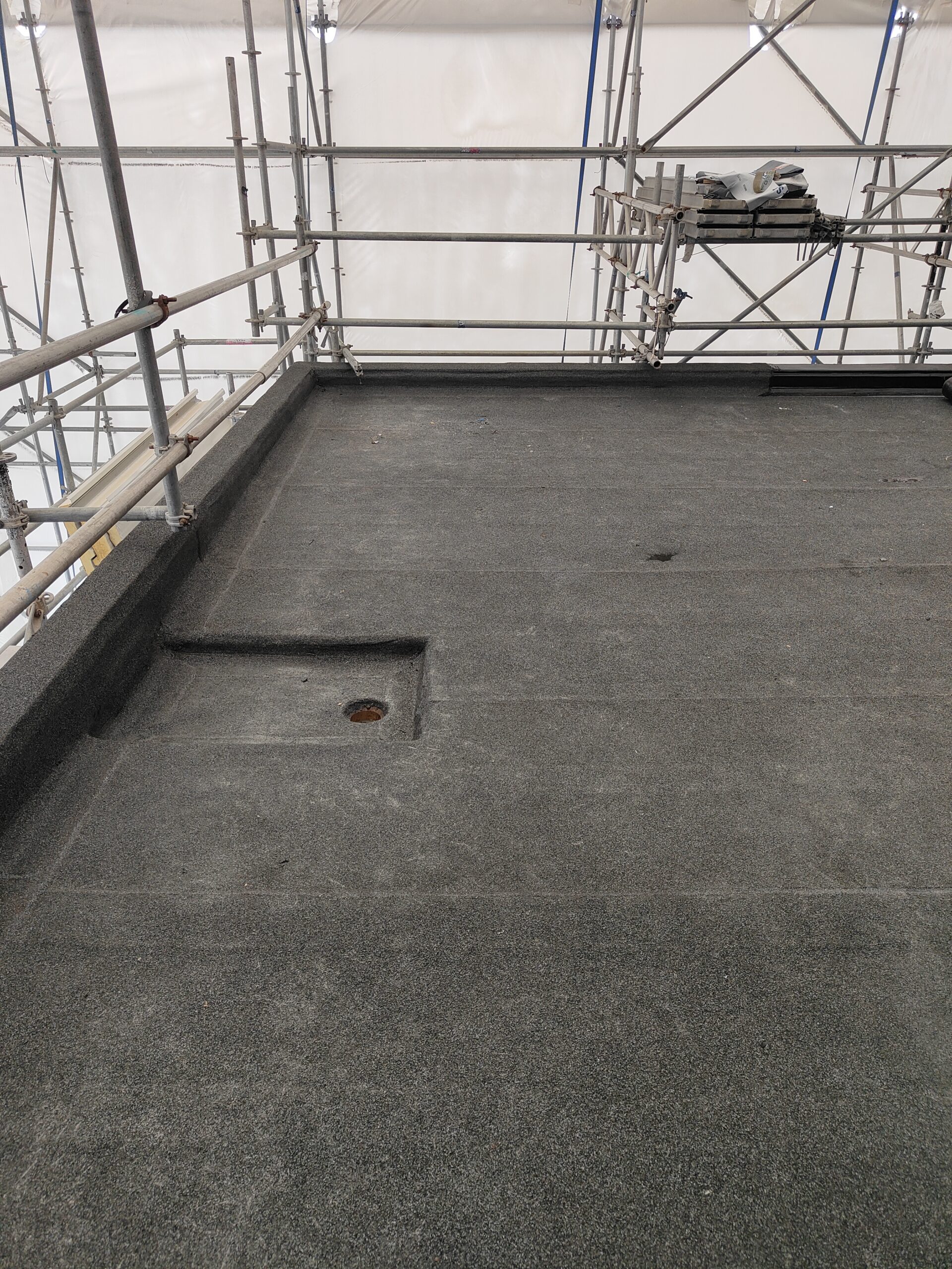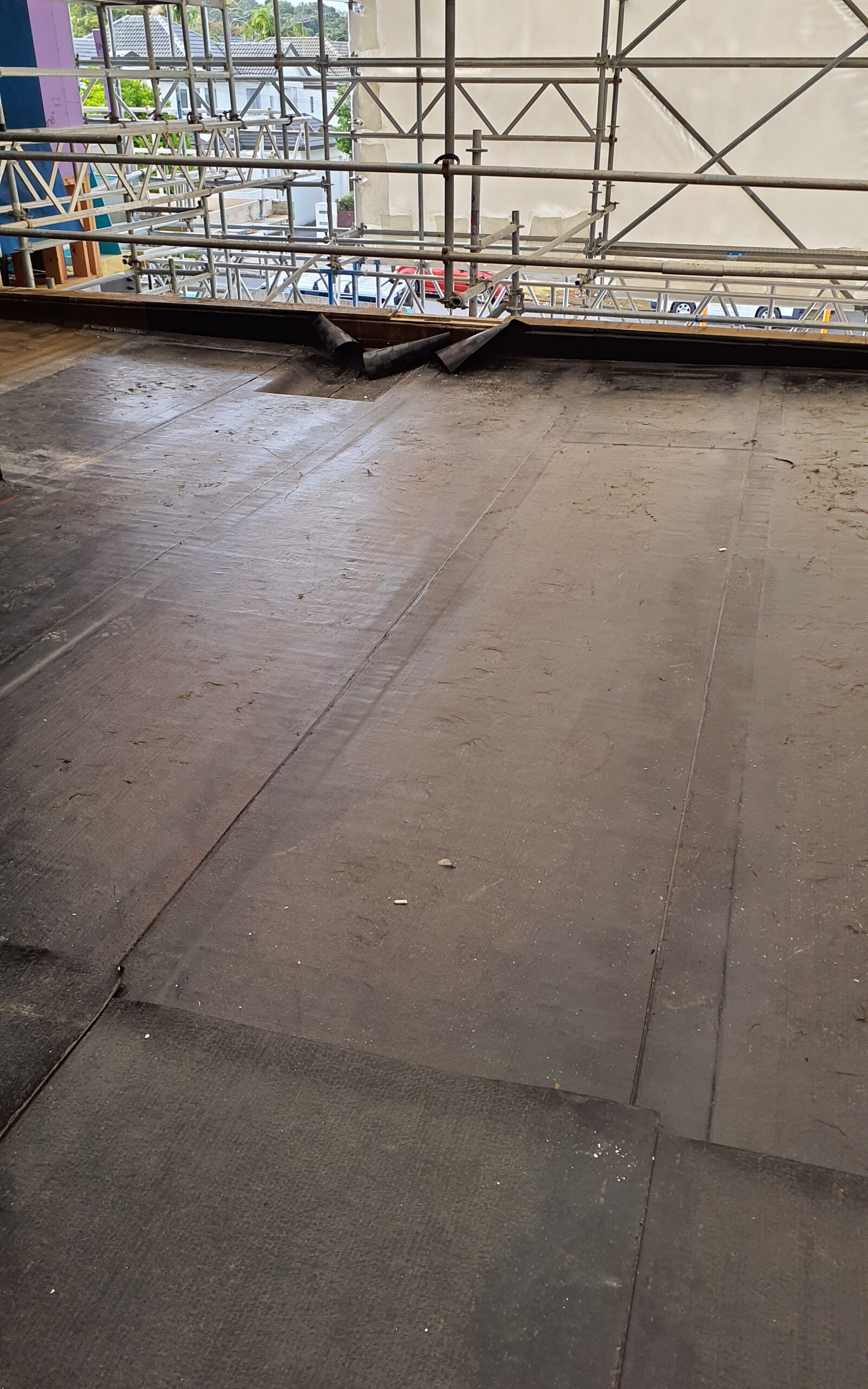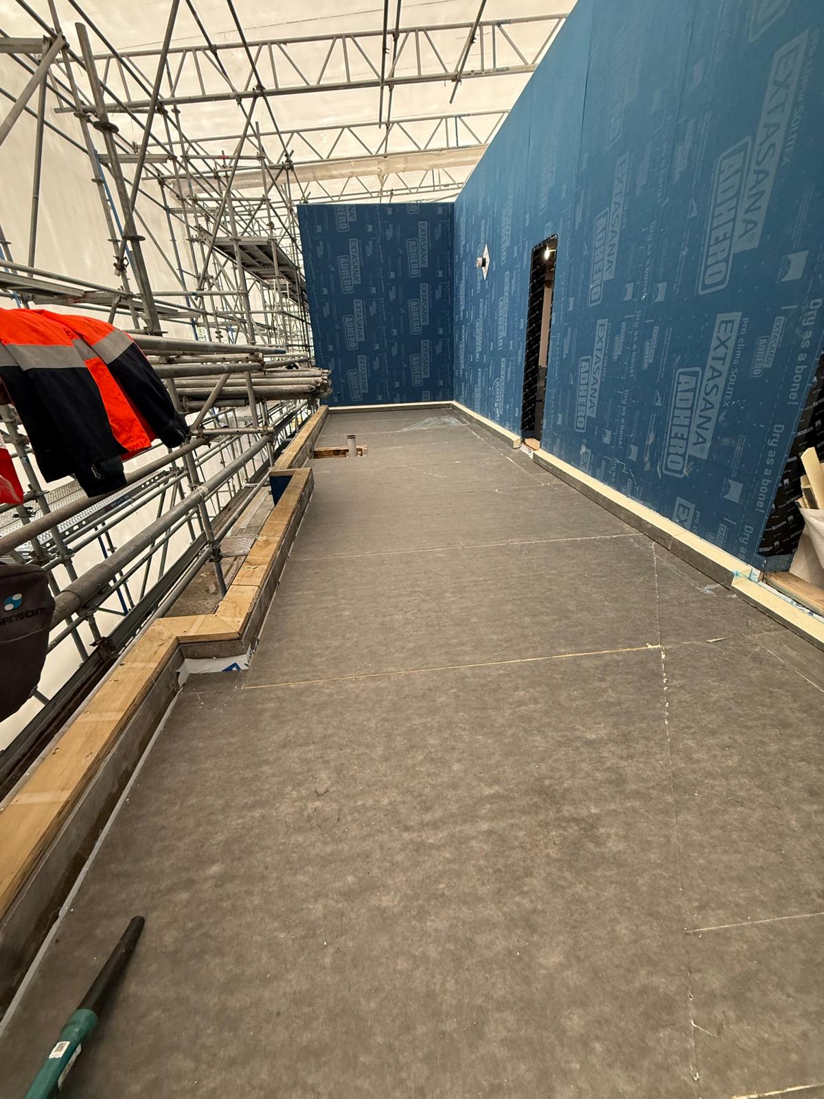 The project involved installing an Allco Casali Warm Roof System to the entrance area, incorporating a build-up of tapered insulation with EPS and PIR, along with Ardex screed to create the required falls. The Level 01 deck received an Allco Casali Double Layer Torch-on System, while the main roof and gutters were fitted with a Warm Roof System featuring 75mm non-tapered PIR insulation and Allco Barrier Tape. All areas included bitumen fillets to upstands and detailed waterproofing to penetrations.