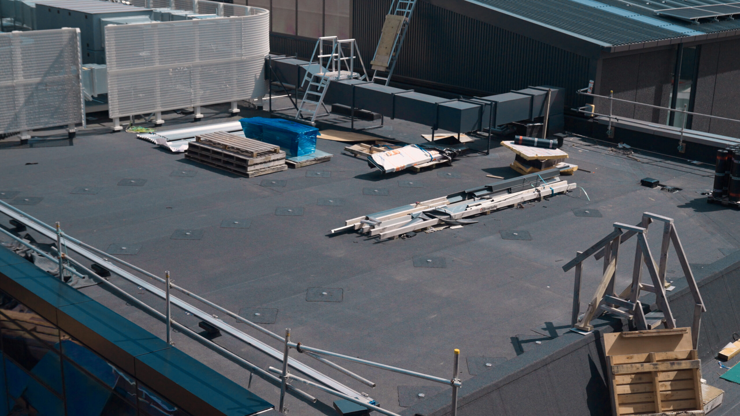 Hundreds of Penetrations: There were many penetrations through the roof membrane for the solar panels, in addition to penetrations for the temporary handrail. We installed hundreds of anchor plates and detailed around these penetrations. Upon completion of the warm roof works, the temporary handrail will be removed, and we’ll return to detail these penetrations.
